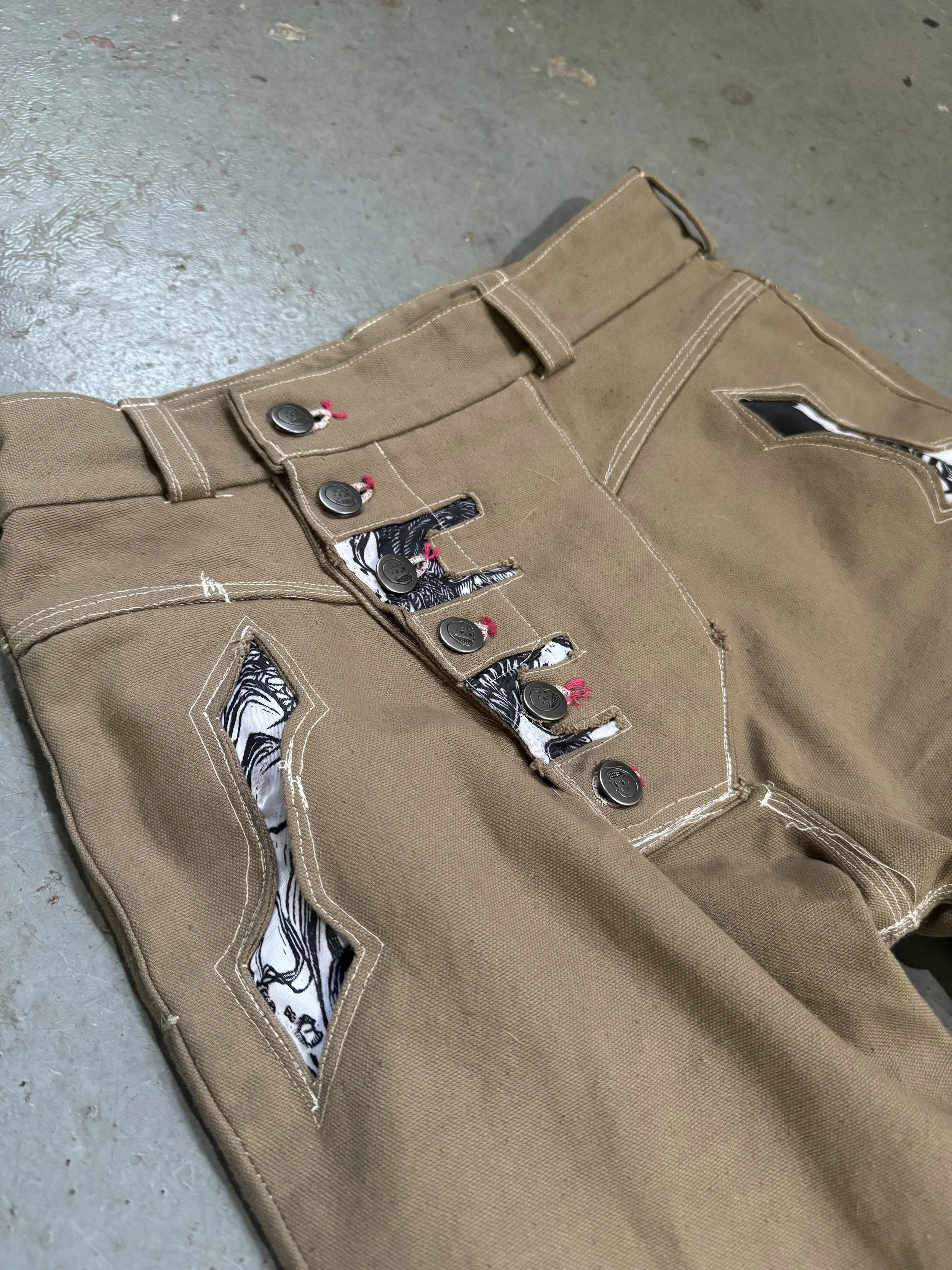 The woodcuts are still hand carved and printed on the presses near and dear to the soul Of the Asylum, but The Asylum will now focus on printing bolts of pfd bull denim and other delicious fabrics and using these yards to make one-of-a-kind garments of all kinds. customs and commissions welcome.