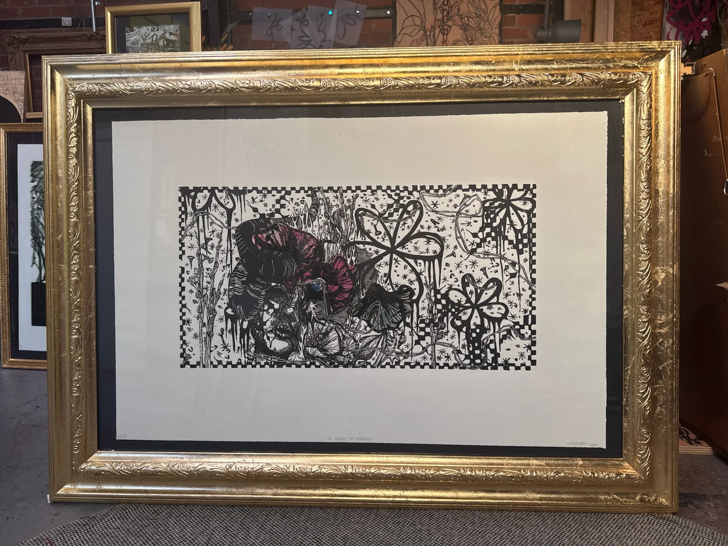 Hand printed, hand carved woodcut with hand dyed chine collé.