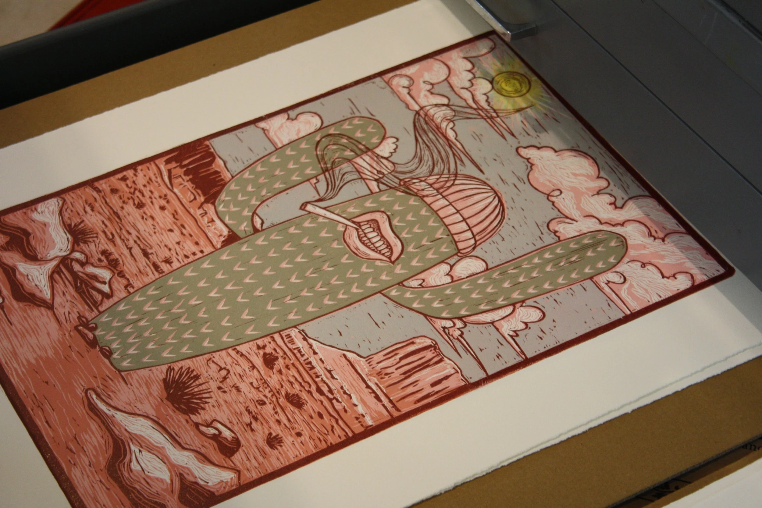Kimber and I used two blocks for this, the red key line on one and all the colors on another. We printed the light pink, and then cut that block into smithereens and printed the rest of the colors next. Finally we dropped the dark red key line on there and called it a damn good day.